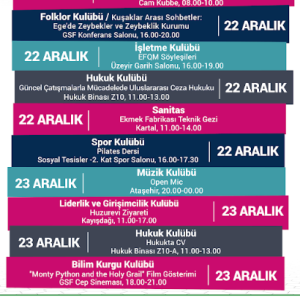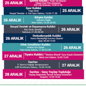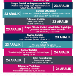 Öğrenci Kulüpleri Haftalık Etkinlik Takvimi Yayında! İlgili kulüplerin etkinliklerini takip edebilir, dilediğine katılabilirsin. Detaylı bilgi için kulüp sosyal medya duyurularına Öğrenci Merkezi Öğrenci Kulüpleri sayfasından ve kulüp sosyal medyalarından ulaşabilirsin. Verimli ve eğlenceli haftalar dileriz!